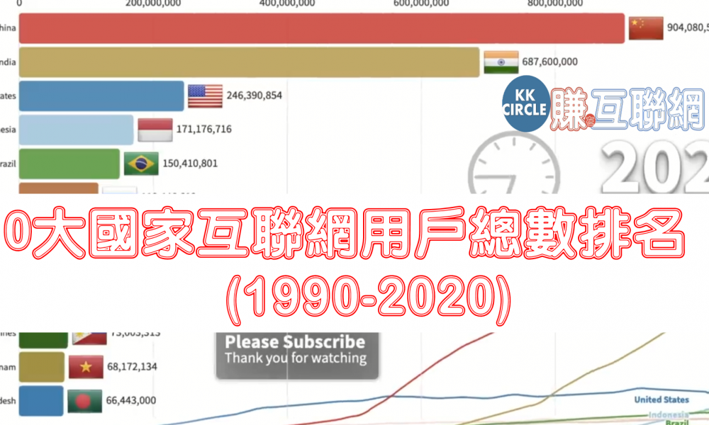 10大國家互聯網用戶總數排名(1990-2020)